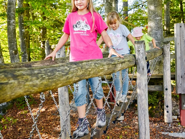 Along the way, you have to find the seven children of the Käfer family who are hiding in various places. The next challenge follows at the carillon. The path then leads over green meadows to the actual destination, the Balmli adventure and barbecue area. Here you will find swings, hanging ropes, or a rope bridge leading up to the eagle’s nest.