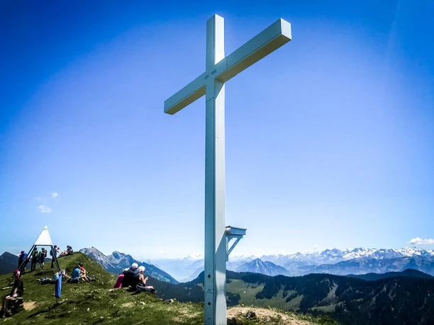 From Schimbrigbad, walk up a meadow path to the edge of the forest. Cross the forest in zigzags. Here, between the trees, you can already catch the wonderful view of Entlebuch. Now follows the most spectacular part of the hike. The last 160 meters of elevation to the summit are mostly on the ridge. At first, young trees line the ridge, but the last meters lead you along the bare, grass-covered ridge. From here, you have a great view of Titlis and the Bernese Alps. Lake Lucerne is also visible on the right side of the ridge. Shortly before the summit, a pasture fence crosses the ridge. A gate gives you free access to the nearby summit cross. Enjoy the panoramic view!