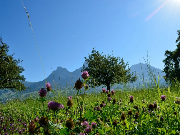 After this chapel follows a short ascent to Unterschönenbuch, a hamlet with 150 residents. The houses of the hamlet are loosely arranged around the magnificent St. Wendelin chapel. This sacred building was completed at the beginning of the early 18th century and is named after the patron saint of farmers. The route continues along the road to Oberschönenbuch. With some luck, sunbathing wall lizards can be observed. Those who want to imitate them will find another bench at the roadside. Thanks to the gained altitude, enjoy a magnificent view of the Muota plain towards the Urmiberg. Then follows another, but gentle terrain ascent on Unterschönenbuchstrasse with a direct view of the Mythen. Colorful meadows and pastures with occasional hedges and fruit trees, as well as rustic farmhouses, characterize the landscape chamber.