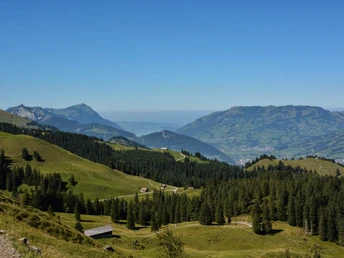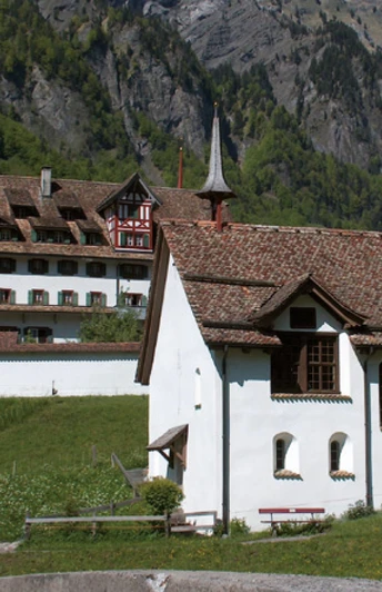 The third stage leads from the monastery St. Joseph in Muotathal to the Antonius House Mattli in Morschach. Most of them are hiking and mountain trails, only rarely do you have to walk on asphalted roads. Alpine pastures, woodlands, flower meadows and valley crossings alternate. You simply walk through this rich, unspoilt landscape. On the third stage, too, you will pass oak columns with contemplative texts that encourage short meditation. The first ten kilometres are mainly uphill, sometimes steep. At the beginning the noise of the Muota accompanies you, later it goes along the deep ravine of the Hüribach. Via the Wannentritt and various alpine pastures you reach the holiday resort of Stoos. On the way, your eyes will feast on the view into the valley to the meandering Muota and the view to the Great Mythen. From Stoos it is only a few kilometres on a light forest path to the Antoniushaus Mattli in Morschach. This is in a wonderful location and is committed to Franciscan spirituality.