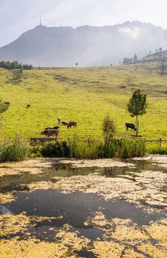 The hiking paradise Seebodenalp lies on a large, prominent terrace at 1020 m above sea level above Küssnacht am Rigi. You walk leisurely on the first section practically flat through the tree avenue. On your route, you pass the Alp Ruodisegg before tackling the rather steeper ascent towards Alp Räb. From the alpine inn onwards, the path gets even steeper, but the view at Rigi Känzeli is worth every effort. The hike is also doable in the opposite direction.