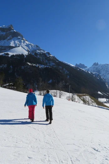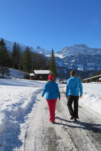 The start of this winter hike is at the railway station. Past the Kurpark you go straight through the dorfstrasse to the monastery. At the monastery church you walk up to the cemetery and over the monastery mat to St. Anna. Cross the bridge and walk along Schweizerhausstrasse over a wide mat to the waterfall and on to the valley station of the Fürenalp railway station. From there you have two options for the way back. You can either take the free sports bus back to the village (see timetable) or hike along the professors' path, all along the Engelberger Aa back to the starting point of the tour.