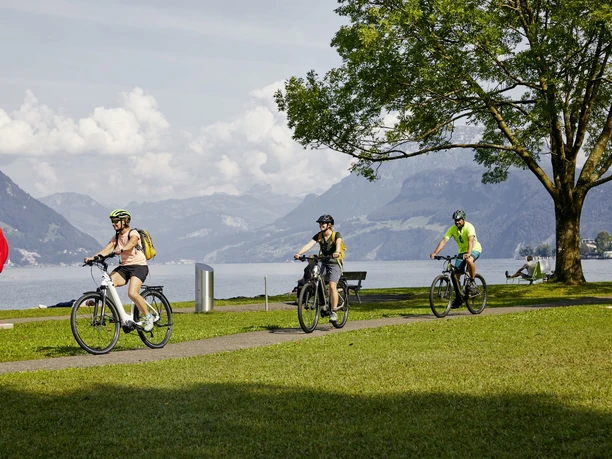 Followed by a descent into the village of Beckenried, where a break directly by the lake is recommended. Then the route leads along Buochsertstrasse to the artificially created "New Zealand" – a popular bathing spot in summer.