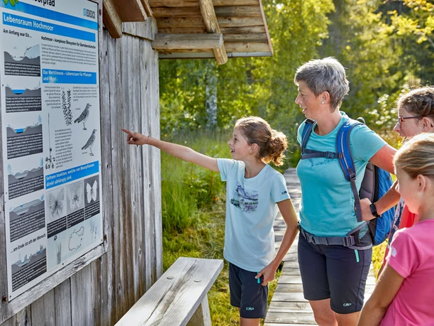 Now it continues comfortably on the plateau towards the Mettelimoos moor area. Especially in autumn, the entire area is bathed in a reddish hue, but it is a wonderful natural area in all seasons. At the "Earth & Moor" platform, you will learn how the moor was formerly mined and how peat was used as heating energy. The moor is home to specialized plants and animals that are found nowhere else. With some luck, you might even discover the carnivorous plant sundew. And then it's "take off your socks" not far from the peat hut, because in the foot bath you should definitely enjoy the beneficial effects of the moor.