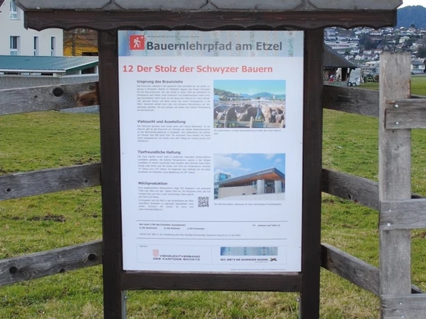 The wonderful hiking area between Schindellegi and Einsiedeln, around the Etzel, offers a huge variety of natural experiences. The landscape presents itself like an open picture book. Landscape and people live together every day, in rain, snow, and sunshine. The farming families cultivate this landscape and are happy to show how and where they work. 14 information boards provide a lot of interesting facts about Schwyz agriculture. Livestock and dairy farming, fruit and viticulture, meadows and their indicator plants, the peculiarities of lowland and raised bogs, organic farming, rural energy production, and many other exciting topics are explained.