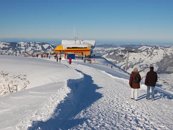 Being virtually level, the circular path could be walked in 30 minutes. But who wants to stomp their way through this wonderful panorama? Too many snow-covered peaks, romantic valleys and blue lakes are waiting to be seen. The powerful nature of the vista must be allowed to gradually flow through the body. The feast for the eyes is followed by a feast for the palate in the summit restaurant. The path is signposted and starts next to the upper terminus of the chairlift, which later returns you to the car-free mountain village of Stoos.