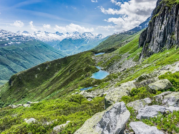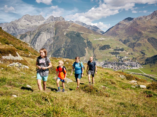 The descent begins via Hospental. A short section leads over a narrow path to Moos. From there, a wide and beautiful hiking path leads along the golf course towards Andermatt.