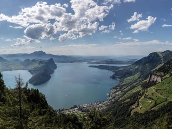 After we turn left at Oberried towards Urmi, we can already catch a postcard view of Gersau in the gap. It steadily ascends through a somewhat enchanted forest – and suddenly, at Stotzig Urmi, a view over the lake and mountains opens up. You will be amazed at how far down the lake already lies!