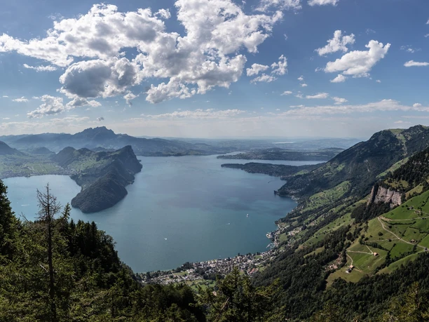 After we turn left at Oberried towards Urmi, we can already catch a postcard view of Gersau in the gap. It steadily ascends through a somewhat enchanted forest – and suddenly, at Stotzig Urmi, a view over the lake and mountains opens up. You will be amazed at how far down the lake already lies! Â