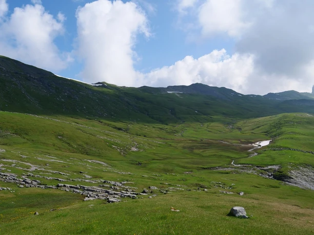 From Erigsmatt, the route leads over alpine meadows and along the edge of the karst fields to the Charetal hut. In the mountain summer, over 1,000 sheep graze here. We cross the valley and climb towards Grossbodenkreuz. Those who want to enjoy the full 360-degree panorama take a short detour to the Pfaff viewpoint. From there you can see the Glattalpsee beautifully. Now it is not far to the Glattalpbahn.