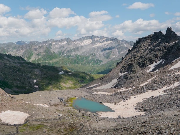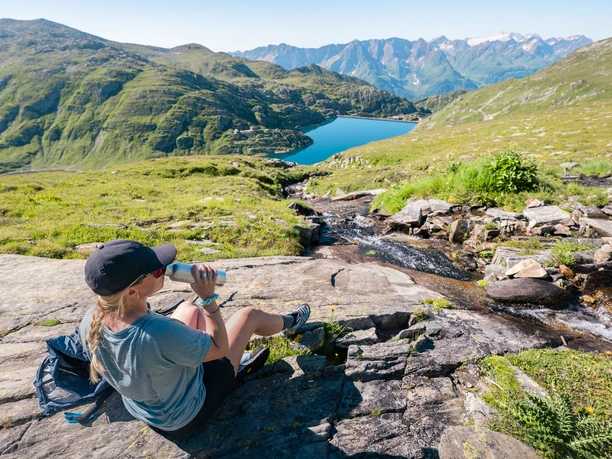 The second stage of the Gotthard Crystal Trek begins at the Gotthard Pass. At first, it runs parallel to the road to the Sella Reservoir. From there, the path climbs steeply, first on an old military road and then on a narrow, little-used hiking trail. After two hours, you reach a lonely pass, overshadowed by the Gloggentürmli. The path continues downhill before the next pass comes into view. The stage runs mostly on a blue-white alpine hiking trail, which requires attention in places. Shortly before the pass crossing, you reach the high plateau "Im Vorderen Loch," where three small mountain lakes above 2,600 meters invite you. Then it continues uphill to the "Gfallenenlücke," with views of the Gemsstock station and the highest point of the Andermatt-Sedrun-Disentis ski area. The descent leads to the Vermigel hut at 2,000 meters, the destination for the day.