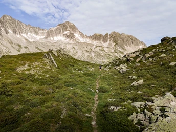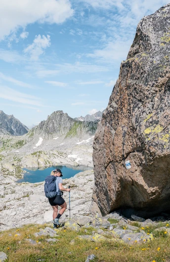 The fourth hiking day starts in Rueras and initially leads in the shadow of Uaul Flurin, before the strenuous ascent to Alp Caschlé begins. After 1,000 meters of elevation gain, you reach the “Platta dil Barlot,” a rock where, according to legend, witches danced. The path leads over a mountain ridge to Lai dalla Stria, also called Hexensee. The blue and white markings are initially hard to see, but a GPS helps with orientation. The fantastic view of the lake and a refreshing swim in the ice-cold water reward the effort. After a short descent, there is another climb to the Mittelplatten, where most of the elevation gain is completed. The view stretches to Lake Lucerne – a surprising highlight. The descent requires concentration, but at the end awaits the Etzlihütte, where you can end the day in the heated, bubbling hot pot.