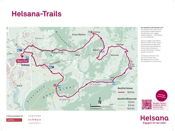 The route leads from the large parking lot in upper Steisteg up towards Schwyz / church. On the right at the church, continue upwards towards Rickenbach. Then follow the hiking trail towards Tschütschi. Once there, continue along the hiking trail to Holzegg and then on to Rotenflue. Here you have the opportunity to refresh yourself at the restaurant. Continue towards the Rotenflue viewpoint and then towards Müsli egg. At Müsli egg, turn right on the hiking trail towards Gross Boden / Handgruobi. From Handgruobi continue towards Ufiberig / Perfiden to the base station of the Rotenflue cable car. Then continue via Waldegg - Hinterdorf back to Schwyz and thus to the starting point.