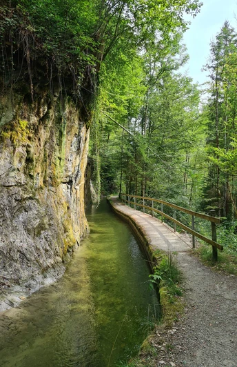 After crossing the main road, you reach Farbsäge and shortly after enter the unique 19th-century Kanalweg. The impressive canal winds along the rock walls. Once the terrain opens up again, you will even come across a climbing garden and a barbecue area. At the canal entrance, you find a wetlands area of national significance.