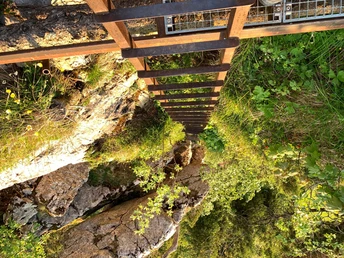 The descent is spectacular from the first moment: We climb down a roughly 17-meter-long ladder vertically to the hiking trail. From there, it continues steadily downwards to the Restaurant Gätterlipass. A cool drink on the terrace rounds off the experience. From there, the way back to Obergschwend is just a short hop.