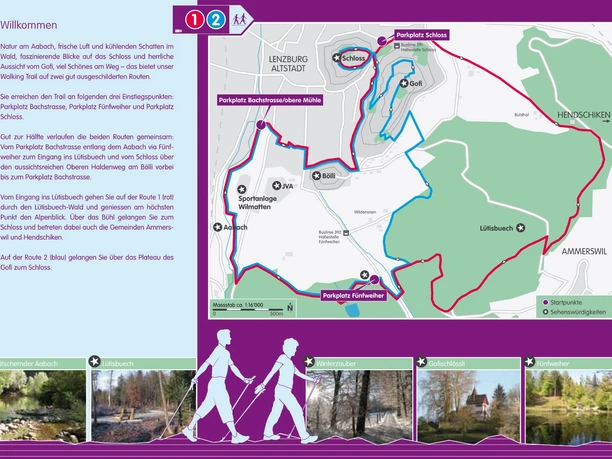 The red route runs from the Bachstrasse parking lot (near Lenzburg swimming pool) along the Aabach via Fünfweiher to the entrance to the Lütisbuech. From there, follow Route 1 through the Lütisbuech forest and enjoy the Alpine view from the highest point. Over the Bühl, you reach the castle and also enter the municipalities of Ammerswil and Hendschiken. From the castle, the scenic Upper Haldenweg passes the Bölli back to the Bachstrasse parking lot.