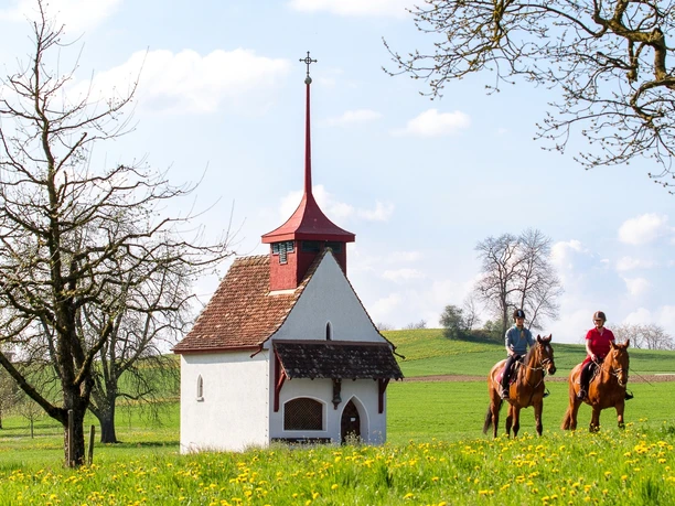 From Hellbühl, the path climbs to the Huobkapelle, from where you can enjoy a beautiful view into the wide Rottal. The route then leads through Ruswil with the mighty baroque church, past the 14 helper saints in St. Ulrich and St. Ottilien, right through the nationally protected village of Buttisholz with the baroque church complex, and over the old Roman road to the Oberroth chapel in Grosswangen. Soon the Wyher water castle comes into view, past the nature study area you reach the destination of the hike – Ettiswil, also called the Florence of the Lucerne hinterland.