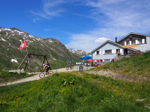 The setting off point for the MTB route over the Maighels Pass is Andermatt. From there, it follows the pass road to the Oberalp Pass. If you are following the standard route, you leave the road at the Oberalp Pass and head for the Tiarms Pass via Val Val back, then descend to Tschamut. You then take the pass road back up to Surpalits then Milez before following an unpaved road. This ascends gently into the Maighels valley, where the Maighelshütte refuge can be spotted up on the left-hand flank. Tip: the route to here can be shortened by bypassing Tiarms Pass and Tschamut and heading straight for Surpalits from the Oberalp Pass: this involves two kilometres of downhill on the pass road.