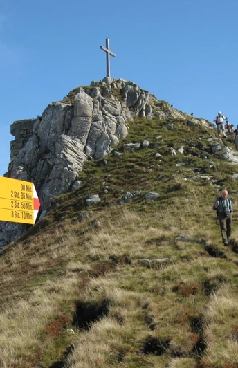 Behind the Tripoli hut, the path leads over steep wooden stairs and the ridge to the Mittaggüpfi (called Gnepfstein in Luzern dialect) at 1917 m above sea level. The Mittaggüpfi served as a lookout far into the Mittelland during World War II.