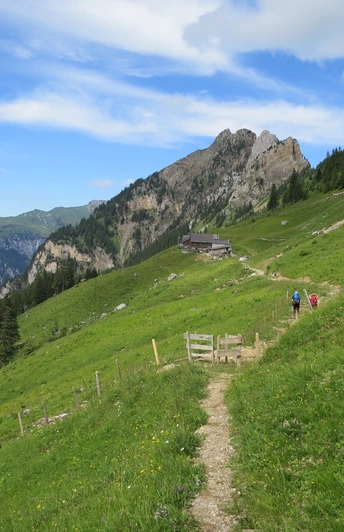 The St. Jakob PostBus stop is the starting point of route 2. The natural road that begins after 300 m leads to Alp Chimiboden. Here the path branches off into the Witen valley (Upper Rüteli). For the further ascent, the hiker has the option of the easy forest path or the old steep mountain path as a variant up to Biwaldalp. The mountain inn, operated during the alpine season, offers food and accommodation options.