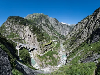 The North-South Route leads through the large Swiss landscapes Jura, Central Plateau, Central Switzerland and over the Alps to southern Switzerland. It follows numerous historically and culturally significant traffic routes and towns. In the holiday region Andermatt, the route runs from the north through the Schöllenen Gorge high above the Gotthard Pass towards Faido.