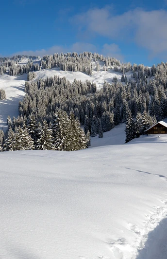 Just one mountain ride with the two cable cars Illgau-Ried and Illgau-St. Karl away lies an untouched winter landscape far from traffic, noise, and the bustling winter sports operation: Here above the 790-inhabitant village of Illgau, the circular route begins.