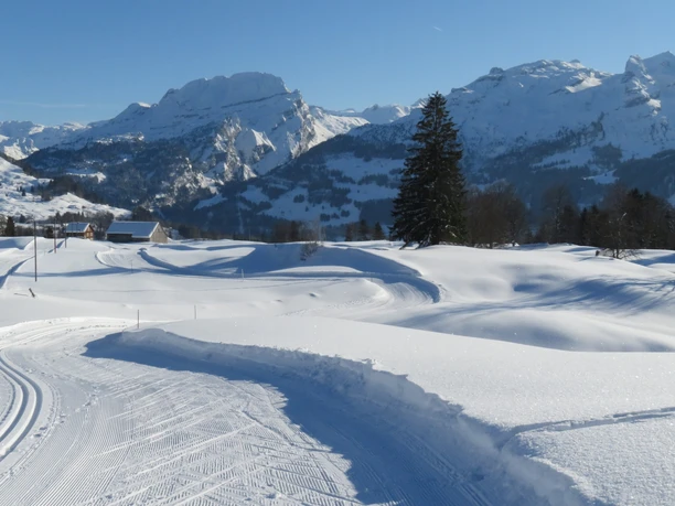 The Schwyz and Ibach ski clubs groom a 5-kilometre cross-country ski trail on the high plateau of the Oberberg. This is connected to the Swiss cross-country ski trail pass. The start is at the Oberberg inn. The profile of the trail is hilly and winding, but very scenic. The Muotathal Alps with Wasserberg, Blüemberg and Chaiserstock greet you on the way. The trail, which is groomed for classic and skating, can also be used in the evening. After-work cross-country skiers switch on the lights themselves.