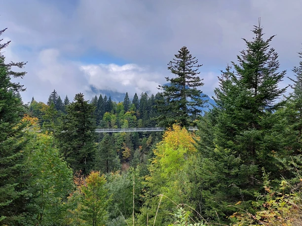 The wise mountain witch has lost her magical powers – only those who solve the puzzles along the way can find the magic stones and help her regain her powers.The trail is about 1.8 kilometers long and takes around 30 minutes to complete, with eight varied puzzle stations along the way. A real highlight is the 374-meter-long “Skywalk” pedestrian suspension bridge, which you cross along the way.