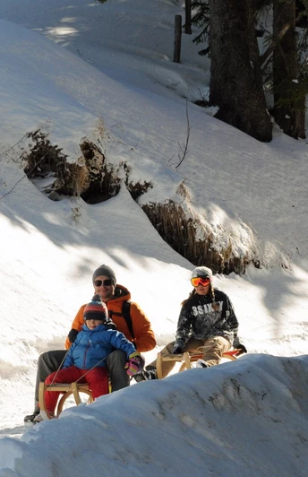 With views of the Glarus and Uri Alps, the sledging track towards the Rätigs middle station starts right at the mountain station of the Rotenfluebahn. The prepared route first follows the edge of the forest until it dives into the forest shortly before the Holzegg ski lodge. The steeper section at the beginning and the winding forest section afterwards provide wonderful variety. In total, the route overcomes about 500 meters in altitude. It thus offers fast sledging fun for the whole family.