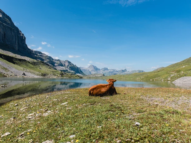 Scenically, Glattalp is one of the most attractive areas and is known for its Siberian temperatures (down to -50° C). Past the chapel and SAC hut, the path leads to Pfaff, a breathtaking viewpoint. The view to the northeast widens and before us lie the huge high plateau of Charetalp and the wild karst fields around Pfannenstock. Unlike Glattalp, where hundreds of cattle are grazed, on Charetalp and Brunalpeli we mainly encounter sheep. On Charetalp lies the archaeological deserted site "Spielplätz," excavated in 1982, a long-vanished alpine settlement dating back to the year 1000.