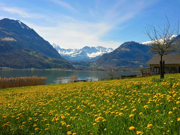 The route starts in Giswil. On the bike path, you reach Sachseln and then the main town of Obwalden, Sarnen. Here stands the Hexenturm with the unique White Book of Sarnen, in which the story of Tell is told. Above Sarnen towers Landenberg Castle, from where the lords were driven out.