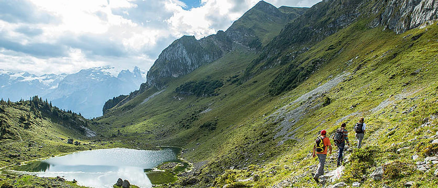 With a bit of luck the eagle will show up to make its circles. A steep ascent and descent over alpine meadows is rewarded with a magnificent view over the high valley of Engelberg. The route leads along the NW-Höhenweg to Zingelalp and then up to Lutersee and Scheidegg. On the other side it goes steeply down to the Arni. The trail leads via Untertrübsee back to Engelberg.