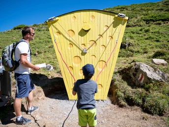 Schmugglis Adventure World at Trübsee, very popular with families, has gained a new attraction. On the mountain hiking trail from the Hüethütte to the Alp cheese dairy Untertrübsee, a new puzzle trail is being created – Schmugglis Sbrinz Path. On the 1.5-hour hike, visitors become cheese smugglers themselves and must secretly bring their cheese wheel on the right path at various skill, play, and rest stations – without getting caught. Only those who are clever enough and have successfully completed a game station receive a letter and can continue with their smuggled goods. At the very end of the route, all letters together form a solution word that visitors must find out.