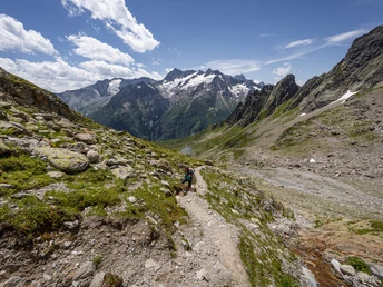 The Sewenhütte, located at 2148 m above sea level, towers on the right, sunny side terrace of the Meiental. The view is magnificent: On the opposite side of the valley, you can see two of the highest mountains in the canton of Uri, the Fleckistock (3416 m above sea level) and the Stucklistock (3312 m above sea level). To the west, the Fünffingerstöcke and the Wendenhorn. Down the valley, you catch a glimpse of the little village of Meien.