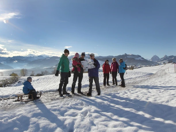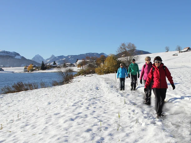 The Sihlsee winter hiking trail begins next to Einsiedeln Abbey, on the snowy meadow above the Brüel parking garage. Around 50 monks live in the traditional Benedictine abbey. The lively monastery square soon gives way to gentle landscape and contemplative calm. The prepared winter hiking trail leads over snowy meadows down to Lake Sihl and along the lake towards Badi Roblosen. At the opposite end of Switzerland’s largest reservoir, the Ybriger mountains rise into the sky.