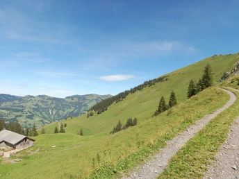 From the Husky Lodge 650 metres above sea level, hike a short distance back along the Muota to the Hintere Brücke bus stop. From there, the hiking trail leads a short distance along the impressive Hüribach stream towards Frutt. Via Höch Weidli through the shady forest northwards around the Schwarzstock, you reach the Wannentritt at 1596 metres above sea level with an impressive view towards the Chaiserstock chain. The trail continues via Laubgarten, then along the gravel track to Tröligen, where you have the opportunity to stop for refreshments at the alpine inn. From there you hike leisurely through the beautiful Chruterenwald forest towards Stoos at 1300 metres above sea level.