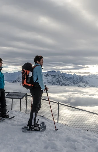 - Snowshoes, winter shoes (good hiking boots), depending on weather conditions wind jacket, sweater, gloves, cap, sunglasses, gaiters and walking sticks.