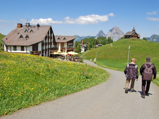From the seminar and wellness hotel towards the old mountain station of the funicular. Around the Stooshorn, then back to the seminar and wellness hotel. From there, around the mountain village of Stoos; via the Morschach-Stoos aerial cableway, along the Ringstrasse. Past the Bergsonne guesthouse (formerly Naturfreundehaus) to the intersection of Rämsenweg and Ringstrasse. All along the Ringstrasse back to the seminar and wellness hotel.