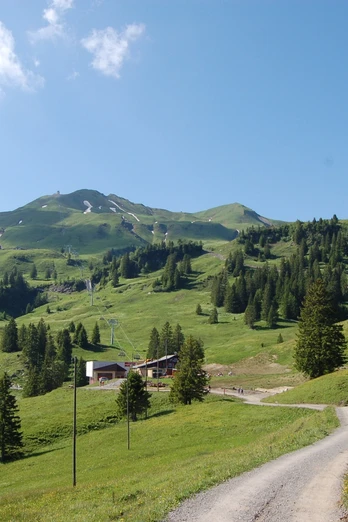 Version 1) Continue straight ahead along the Ringstraße to the aerial cableway of Morschach-Stoos. From Restaurant Alpstubli, continue straight ahead to Restaurant Bergsonne (formerly Naturfreundehaus). Go past the Chalet Bärgfründ, along the upper Ringstraße to Rämsenweg.