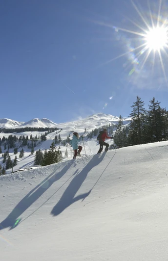 The snowshoe trail starts 100m from the top station of the Schwyz-Stoos funicular railway. It first leads on the same route as two other trails through the hilly landscape near the village of Stoos and yet secluded and quiet to a junction near the Brunnerboden. From there the snowshoe trail leads along a winter hiking trail until it turns right. Through this idyllic area you can reach the highest point of the trail at Waldhüttli and take a short break if necessary. Following the purple marking poles, you descend over a steep spot at the tread edge to the valley station of the chair lift Klingenstock and the restaurant Klingenstock. The trail officially ends there. But of course you can continue with the snowshoes back to the village of Stoos, where there are various catering facilities.