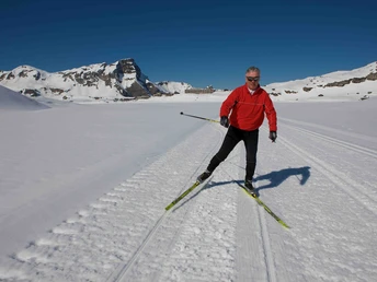 The cross-country trail entrance is located directly next to the panoramic lift at Melchsee. Before putting on skis, the short lift ride up to the viewing platform, just under forty meters above Melchsee, is worthwhile. Up there awaits a view of the impressive Obwalden mountain panorama, which on the east side is flanked by the Titlis and stretches over the Wendenstöcke, Balmeregghorn to the west side to Brünighaupt. Below, at dizzying depths, lies the lake.