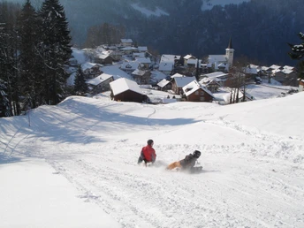 It is also recommended to try out the handmade ski racks, which can be rented at the valley station. The trail is prepared daily in good snow and weather conditions. Sledges or Skibock(Gemel) can be rented at the valley station (Fr. 8.- per sledge or Skibock / depot Fr. 20.-)