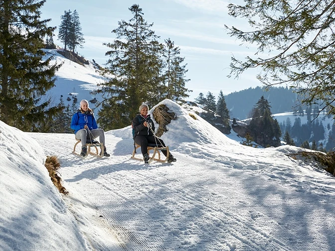 Good winter equipment: weather-appropriate clothing, hiking boots with a good grip, gloves, helmet. Right next to the Rigi Kulm mountain station is the Rigi Kulm rental center, where sleds can be rented.