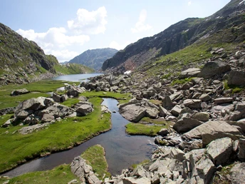 From the Oberalp Pass, the hiking trail initially leads towards Tschamut across alpine pastures with beautiful flora into the Maighel Valley. A narrow mountain path finally leads to the source of the Rhine. The idyllic Tomasee is beautifully embedded in a large basin surrounded by an impressive mountain backdrop. Here, the water begins its 1230 km long journey to the mouth of the sea near Rotterdam. The Rhine then flows through the canton of Graubünden and up to the Rhine Falls in Schaffhausen. From there, the Rhine then runs via Basel through Germany into the sea in Holland.