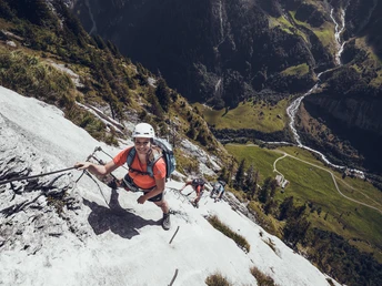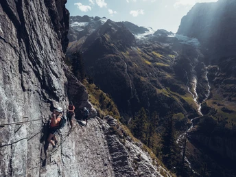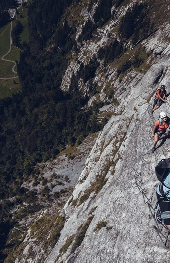 The Fürenwand via ferrata leads through the towering Fürenwand. It is steep and extremely exposed. The route is spectacular. The protection of the via ferrata is excellent. The Fürenwand is exposed to the southwest. Orientation is easy. The Fürenalp directly above the wall invites you to stop for a break. With the Fürenalpbahn you can save yourself the descent. Alternatively, a hiking trail leads down into the valley. An extremely exposed rope ladder is certainly the highlight and at the same time the key point of the climb.