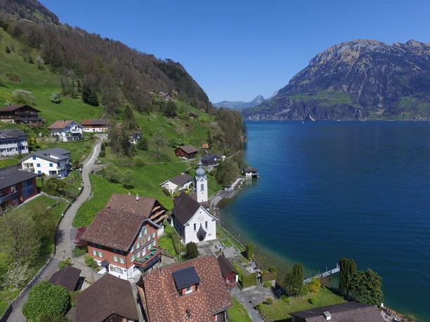 Seelisberg offers a great view from the Schiller balcony and later from the Marienhöhe of Rütli, Lake Uri, and the two Mythen mountains. Through the romantic Tannwald and past the Bergseeli, Beroldingen Castle at an ideal location invites you to a short rest and visit to the chapel with the Rococo altar. Now it goes downhill with 960 steps on impressive historical path surfaces with built alleys and paved paths to cushion the steep descent. Bauen on Lake Uri is climatically favored, allowing banana and palm trees to grow here. At the remarkable village church stands the monument of Father Alberik Zwyssig. A final ascent leads over the old country road and the magnificent viewpoint Bärchi to the village of Isenthal, the end of the Via Urschweiz.