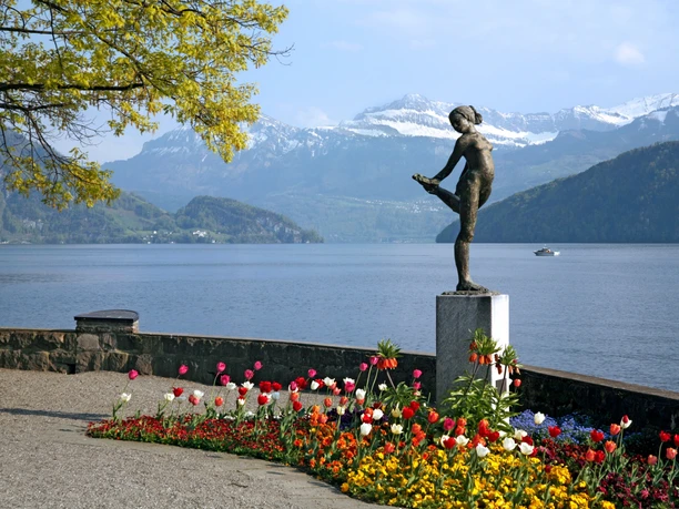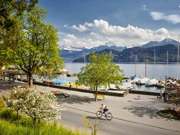 The walk from the Weggis boat station to the Hertenstein boat station follows an idyllic path along Lake Lucerne – partly along the lakeside promenade, partly on the sidewalk. The path is flat, well-maintained, and without any significant inclines, making it a very easy and pleasant stroll. Thanks to the level terrain, the route is ideal for families with strollers, as well as for people with limited mobility and wheelchair users. Along the way, beautiful views of the lake and the surrounding mountains open up again and again. The path invites you to take a leisurely stroll. Several benches are available along the route, inviting you to linger and enjoy the scenery. You can conveniently return by boat.