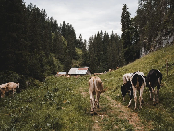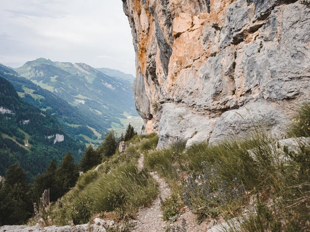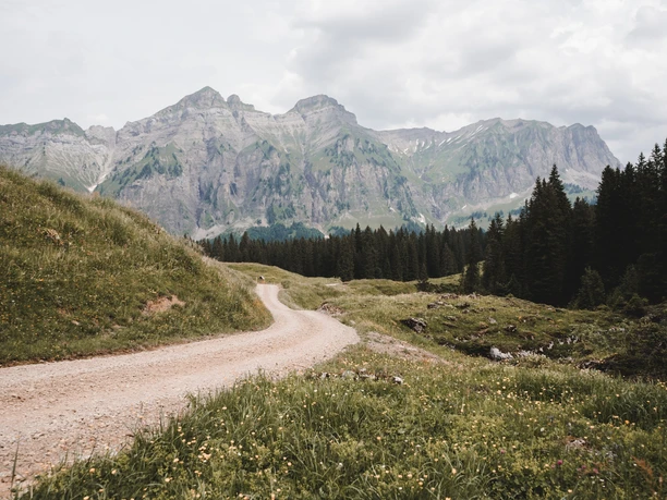 From the Stalden bus stop, follow the asphalt road uphill towards Pragel. Forget this part of the hike; you will be compensated a thousandfold by the rest. At Äbneli/Sturzegg, take the turnoff towards Fedli – (Gross Band) – Gschwänd. The ascent along the steep cliff is challenging, but so are the natural beauties and views! The higher you get, the more open the panorama becomes, and the Urner peaks with firn snow are within reach. Afterwards, follow the mountain path over alpine pastures to the “Eigeliswald” parking lot. The forest areas nearby are known as “Urwald Bödmeren.” You walk downhill along the Pragel road to the signpost in Fruttli. Here you switch to the north side of the Starzlen and thus reach the Plate Path, which crosses a historic mountain debris cone. Huge slabs invite you to linger, and rare orchids bloom by the path. Through Horgrasen, it goes back to the starting point Stalden.