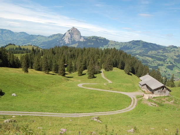 From the Riemenstalden, Chäppeliweid bus stop, hike to the Alpwirtschaft Goldplangg. From the Höchi, it goes steeply uphill around the mountain flank at Wannentritt. From there, enjoy the beautiful view of the Mythen and the Oberberg.