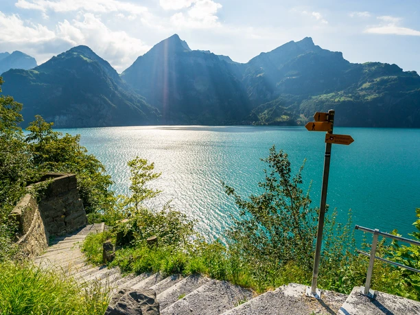 The Weg der Schweiz winds around the deep Lake Uri, sometimes high above, sometimes right on the shore. Sometimes it leads you over stairs carved into the rock, then again follows wide, comfortable paths past many rest and bathing spots. Time and again you enjoy a magnificent view of the lake and the surrounding mountains. Thanks to the boat services, you have a choice of many possible starting and end points.
